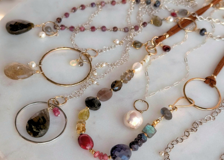 I create each design with sterling silver and gold-filled metals, hand-soldering and hammering every clasp, hoop, and earring hook. I hand-select each gemstone for its natural beauty and the unique meaning it carries.