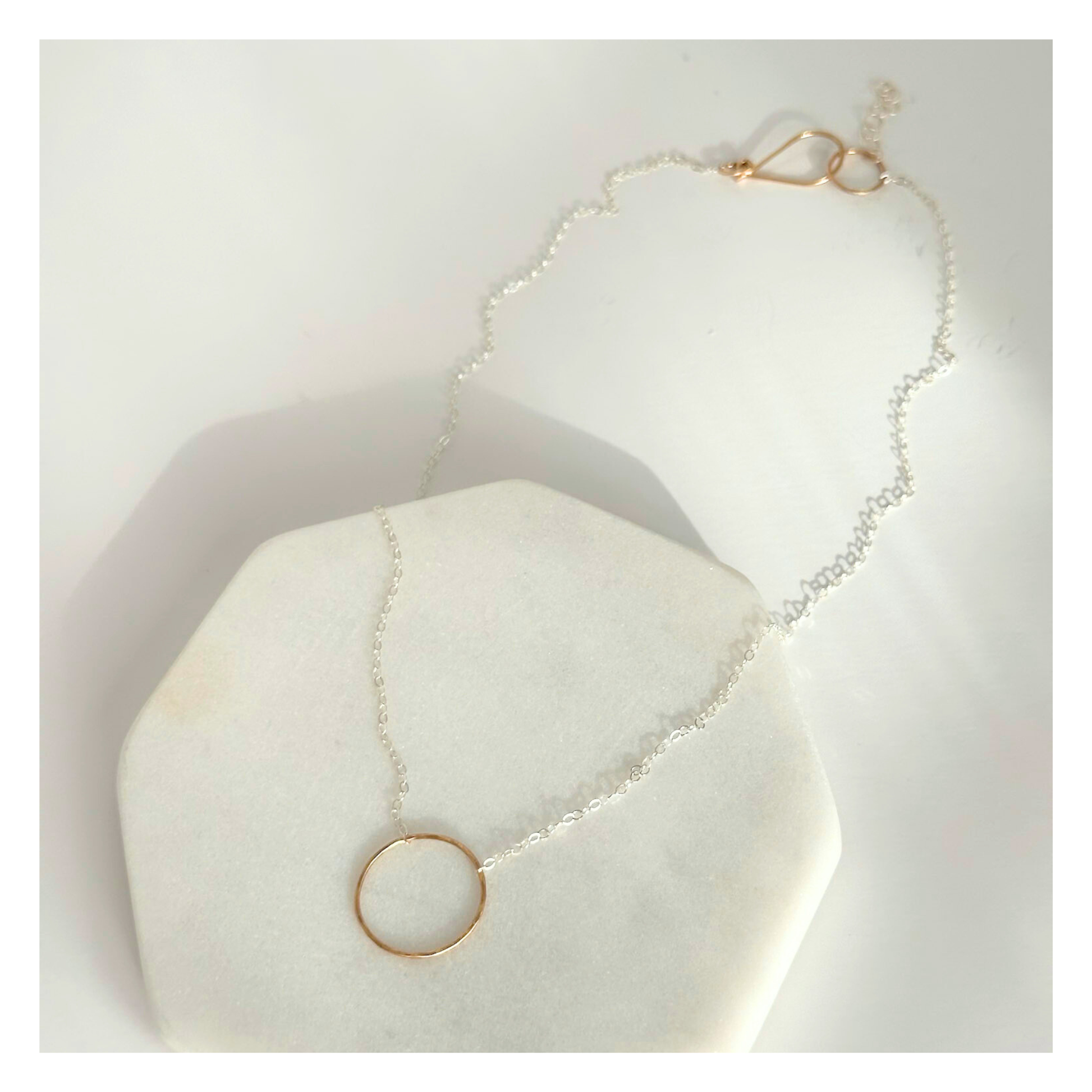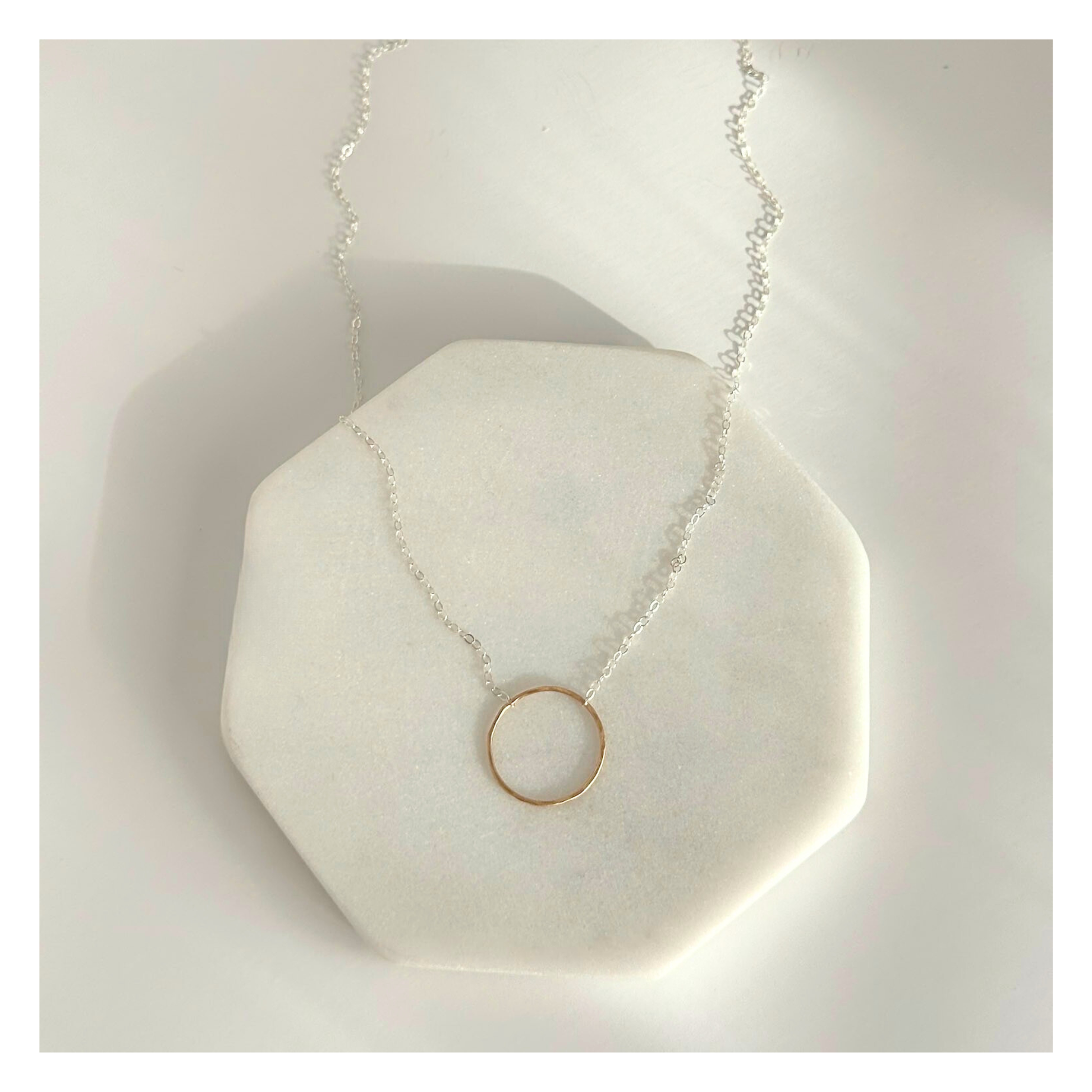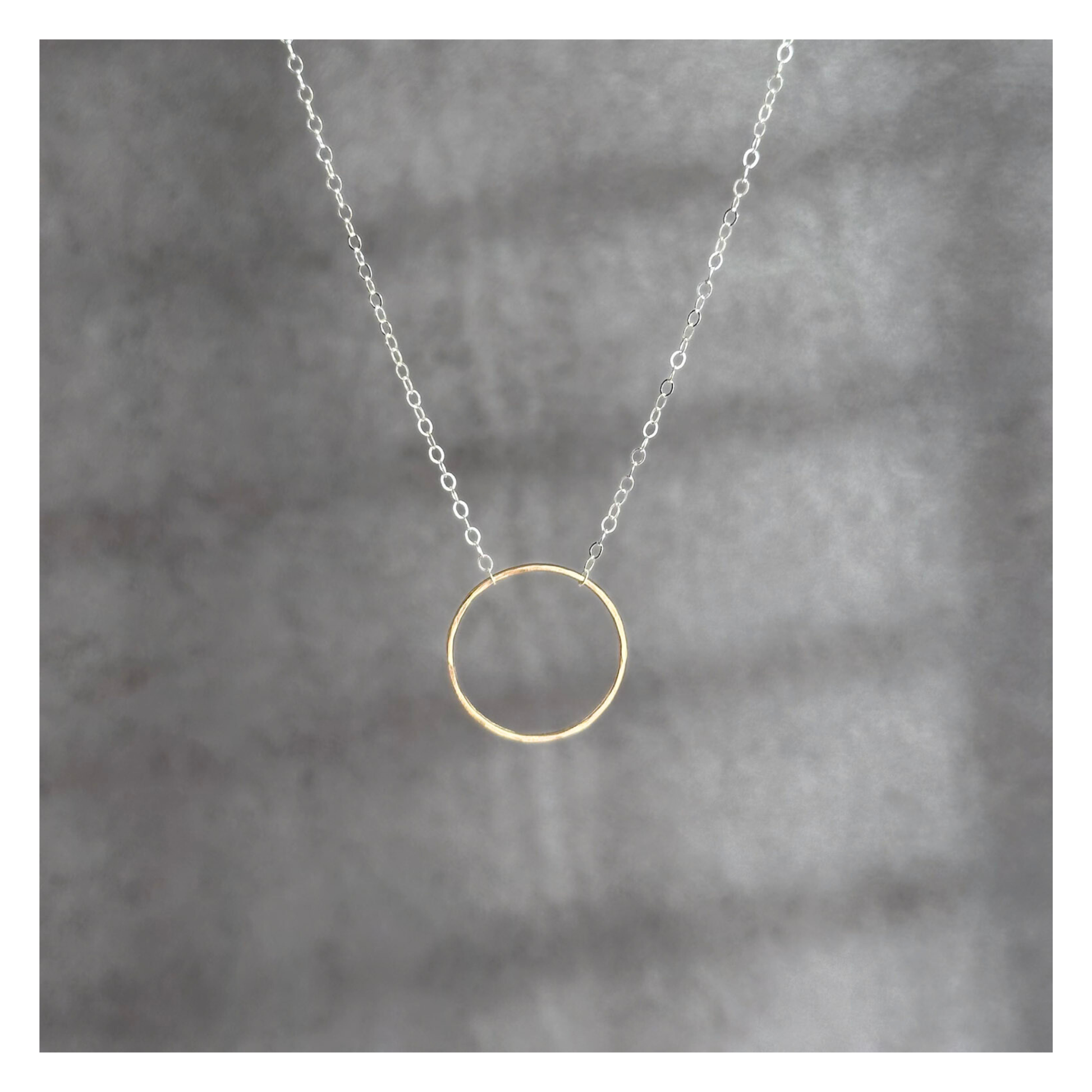 Hand-soldered and hammered gold-filled hoop rests gently on a fine sterling silver chain.