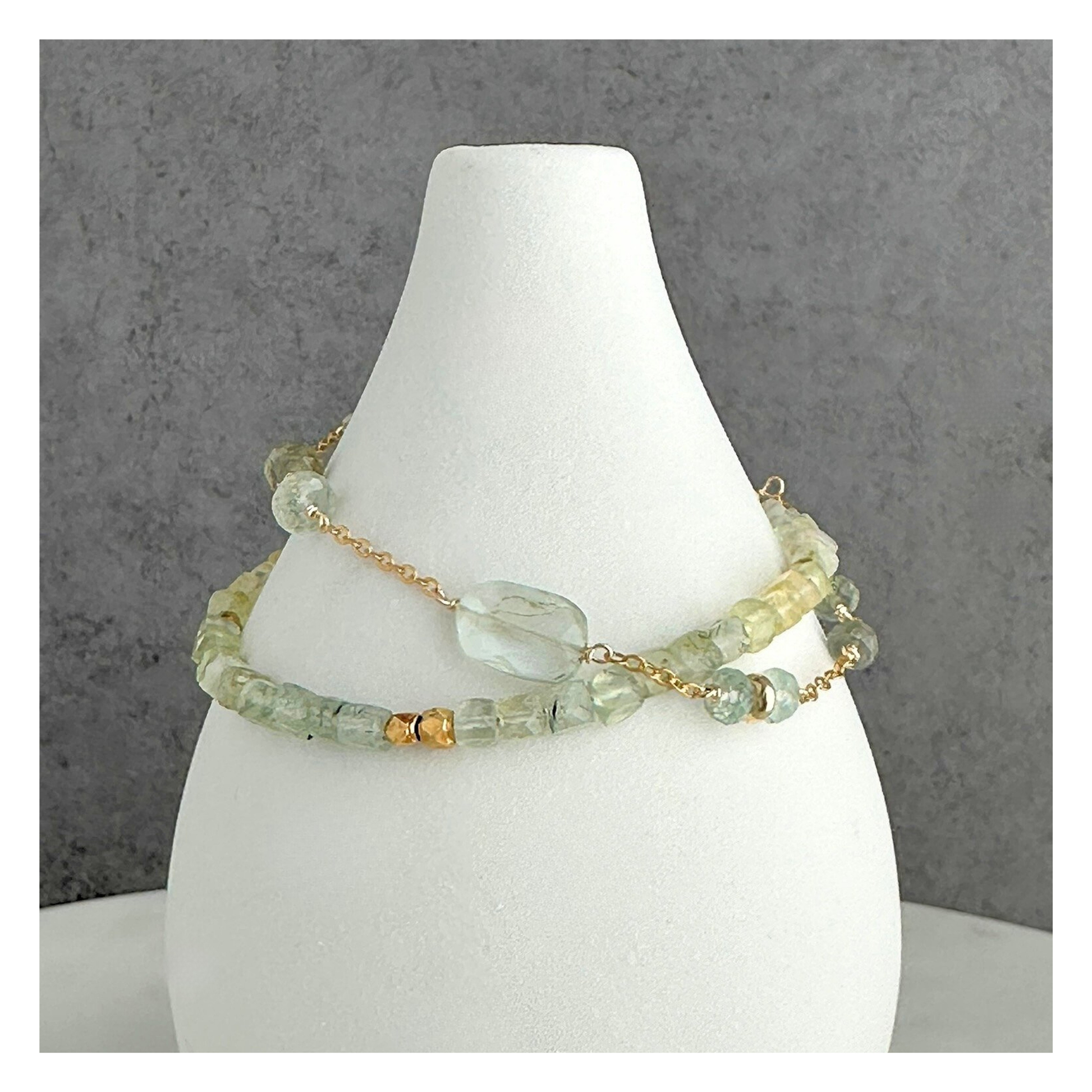 Two strands layered together, one beaded with cubes of prehnite, the other linking moss aquamarine along a delicate gold-filled chain.